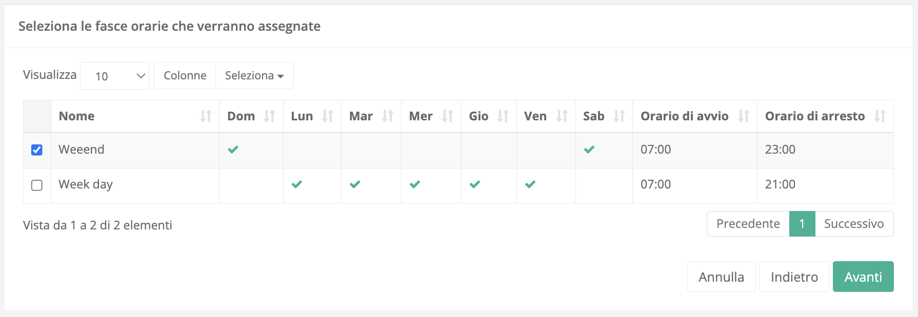 Dall’elenco “Seleziona le fasce orarie che verranno assegnate” puoi visualizzare le programmazioni già create in precedenza (es.: Week day, Weekend) e, per ciascuna: