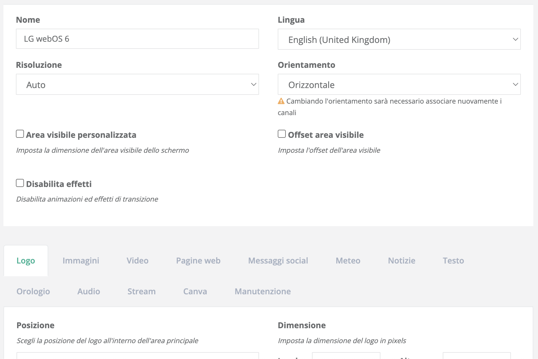 Questa schermata consente di configurare la risoluzione del dispositivo, l’orientamento e la modalità di visualizzazione dei vari contenuti, oltre a varie impostazioni.