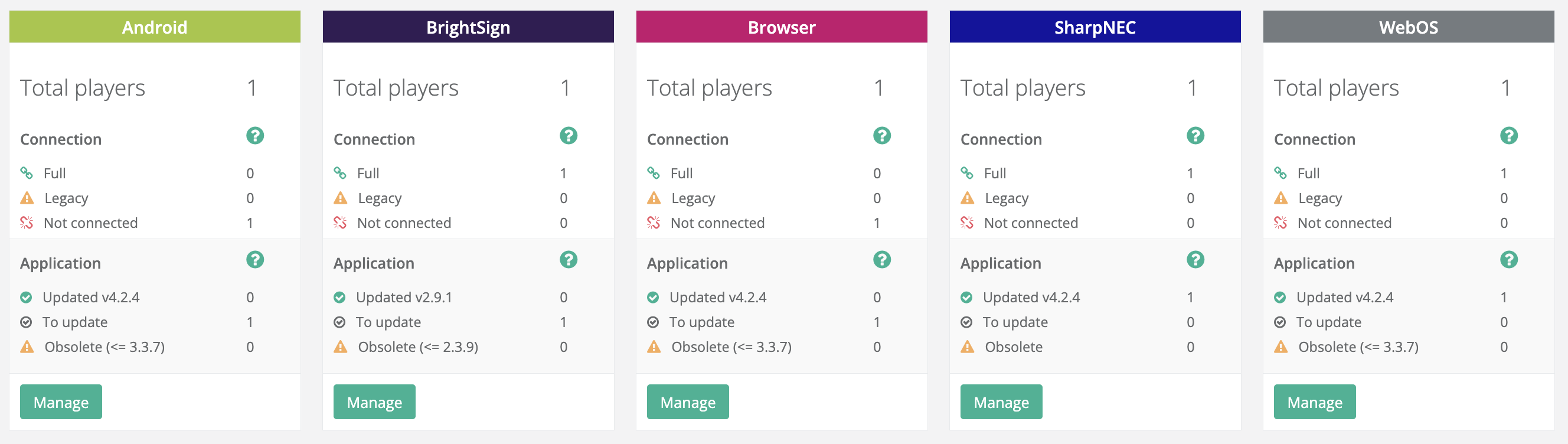 For each player type (Android, BrightSign, Browser, Sharp/NEC, WebOS, …) you’ll find a card with the total number of devices and two summary areas: