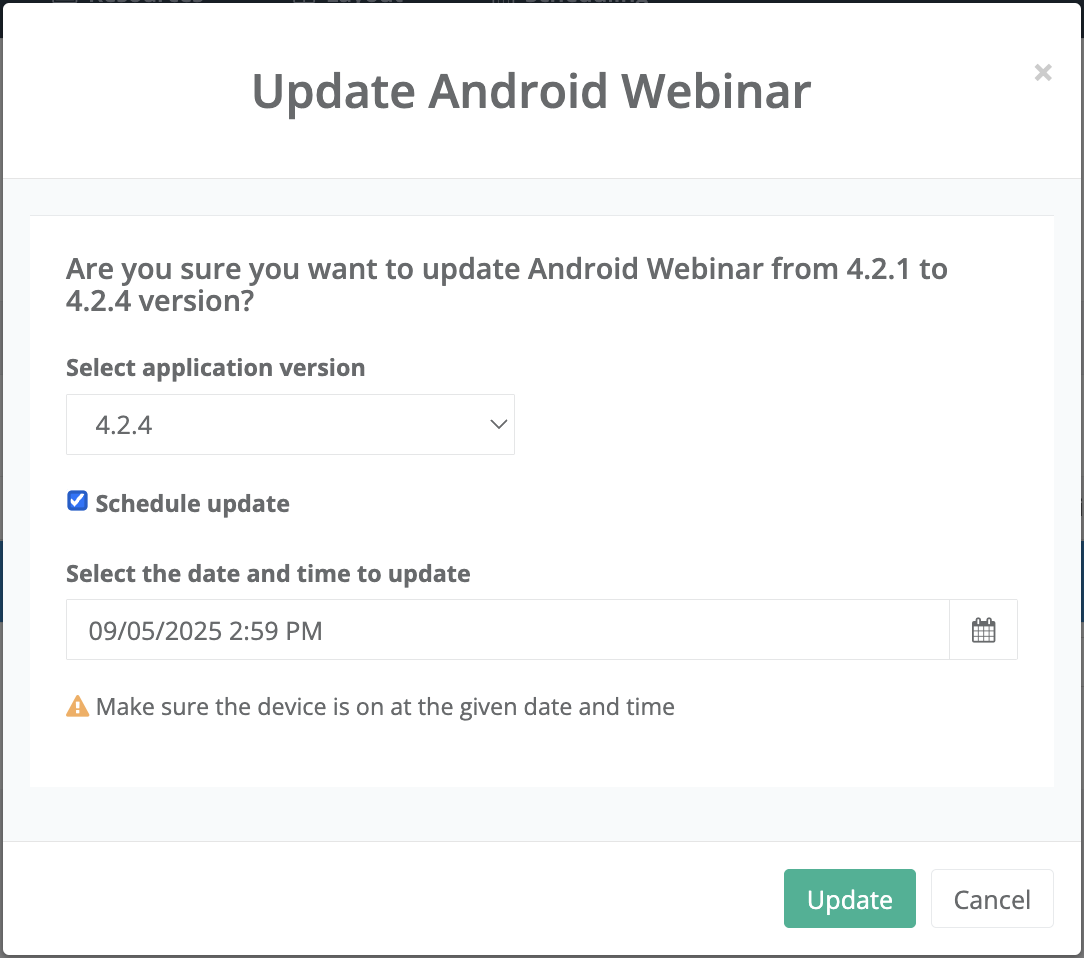 - Scheduled update – select date and time (useful for maintenance windows, outside opening hours)